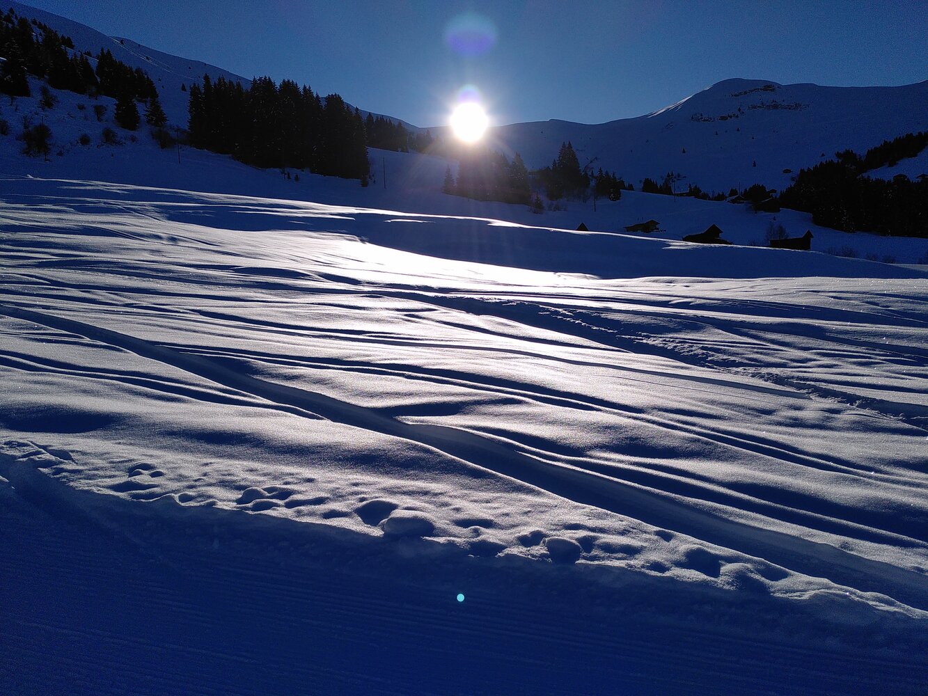 Noch die letzten Sonnenstrahlen dieses Wintertages geniessen und dann mit dem Schlitten ins Dorf hinunterfahren. Gesättigt von Sonne, frischer Luft und Lebensfreude.